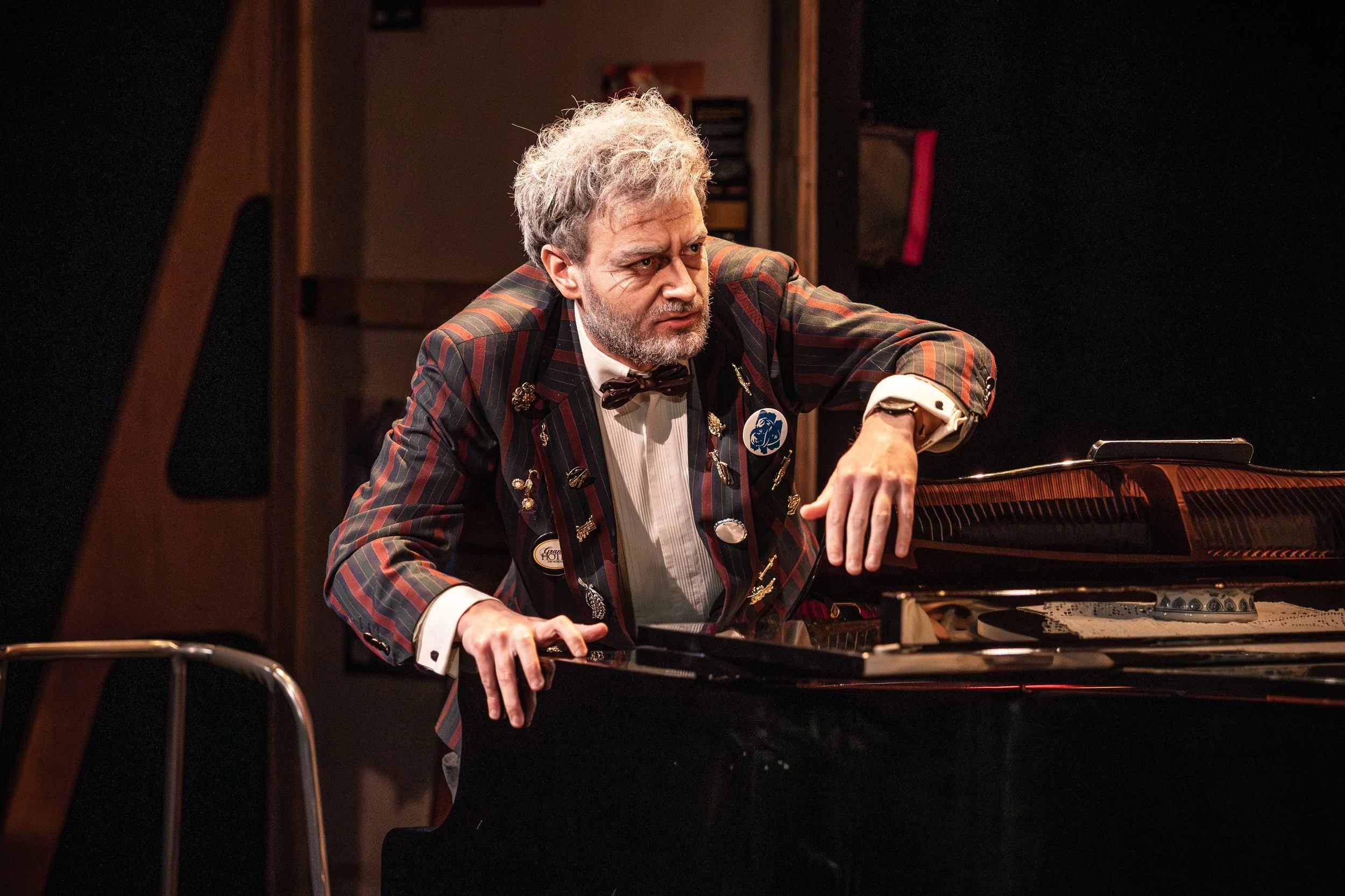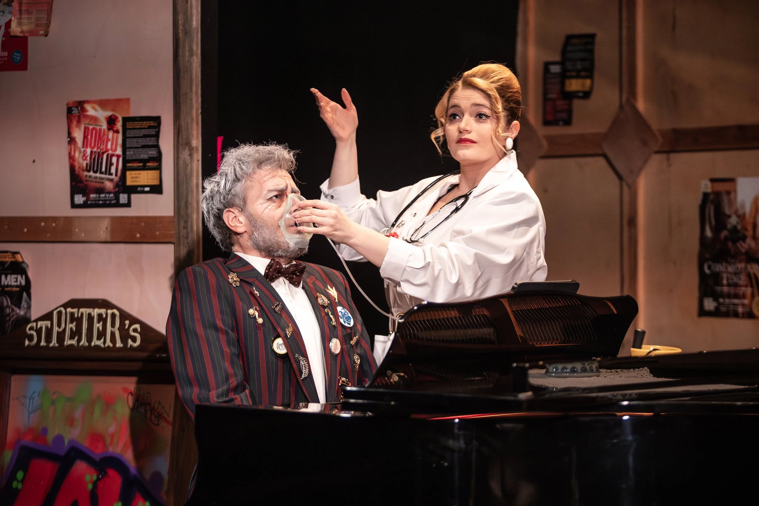 Musical director / actor and pianist Archie Combe sets the pace—both with his opening excruciating stage-wide wobble-with-a-walker and with oxygen mask-fuelled superb playing through a catalogue of golden oldies ranging from opera to jazz to ballad to pop to rock as, when Sister Shea’s back is turned, the oldsters creakingly morph from desultory silent slump to strut their stuff, bicker and reminisce.